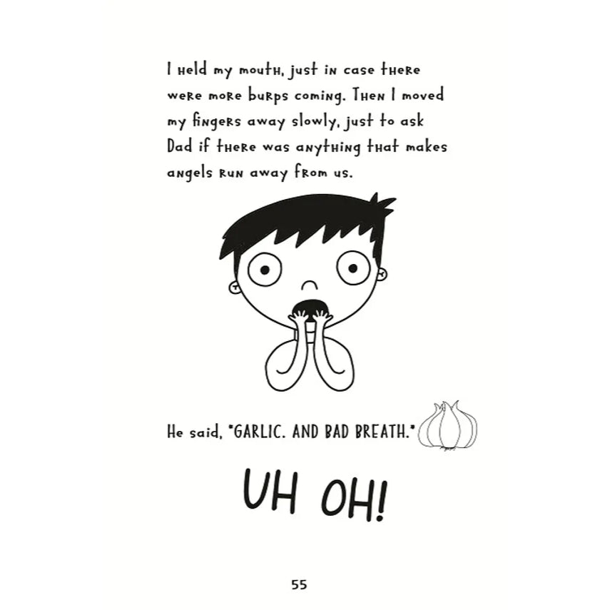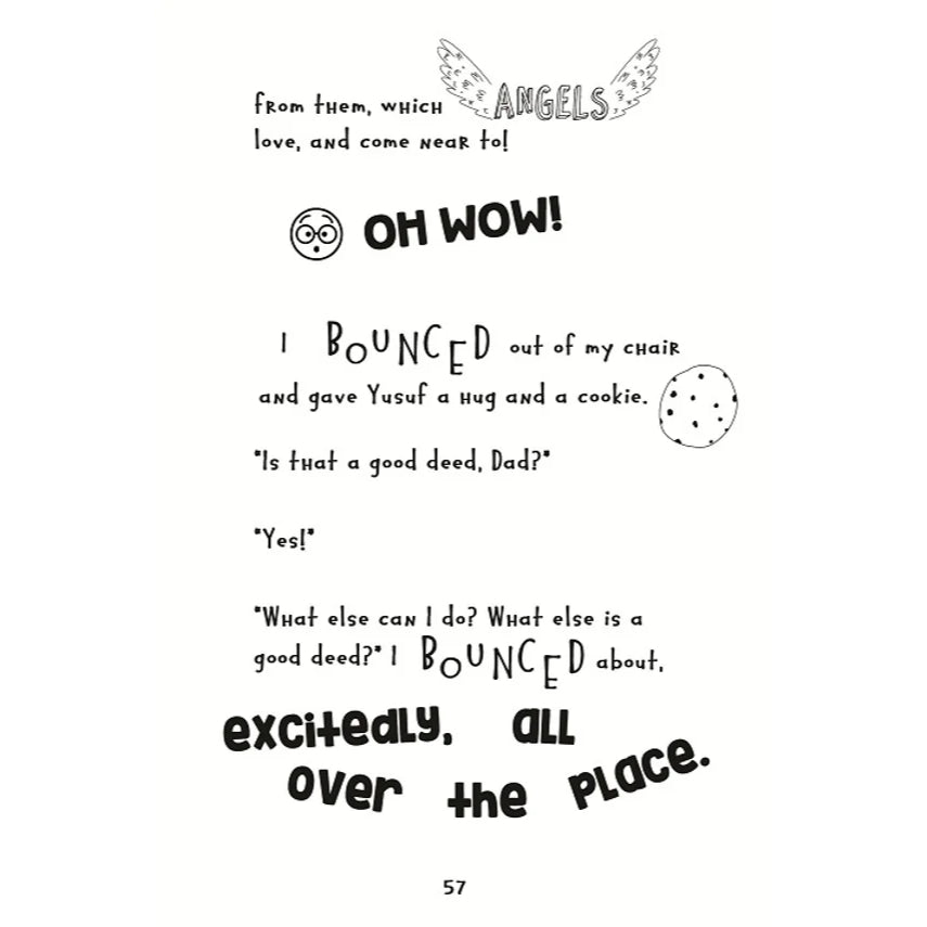 "I'm Eliyas. I'm really good at explaining things my adults told me about, which is handy for you if you're curious about Angels. My family is kind of wacky, you'll hear lots about them too, and the funny things that happen to us, but mostly about angels. Some things you can find out about angels if you read this: what they are, what they look like, what mind-blowing things they do, how to make them come near you, and lot's more!"
