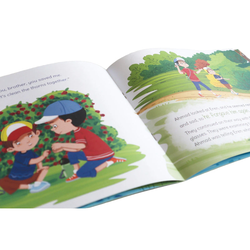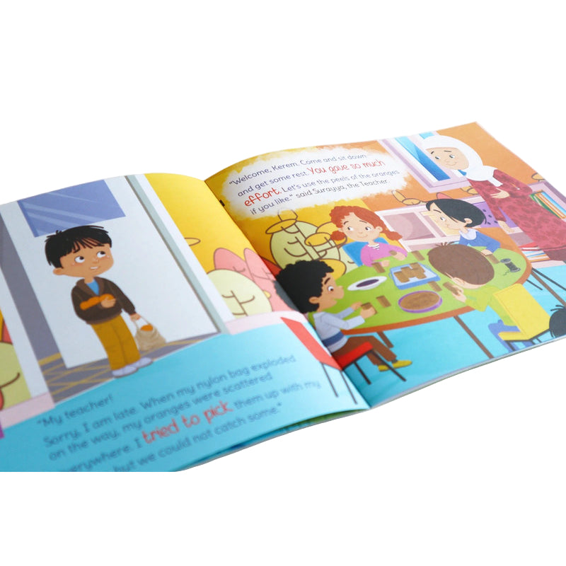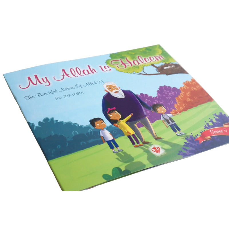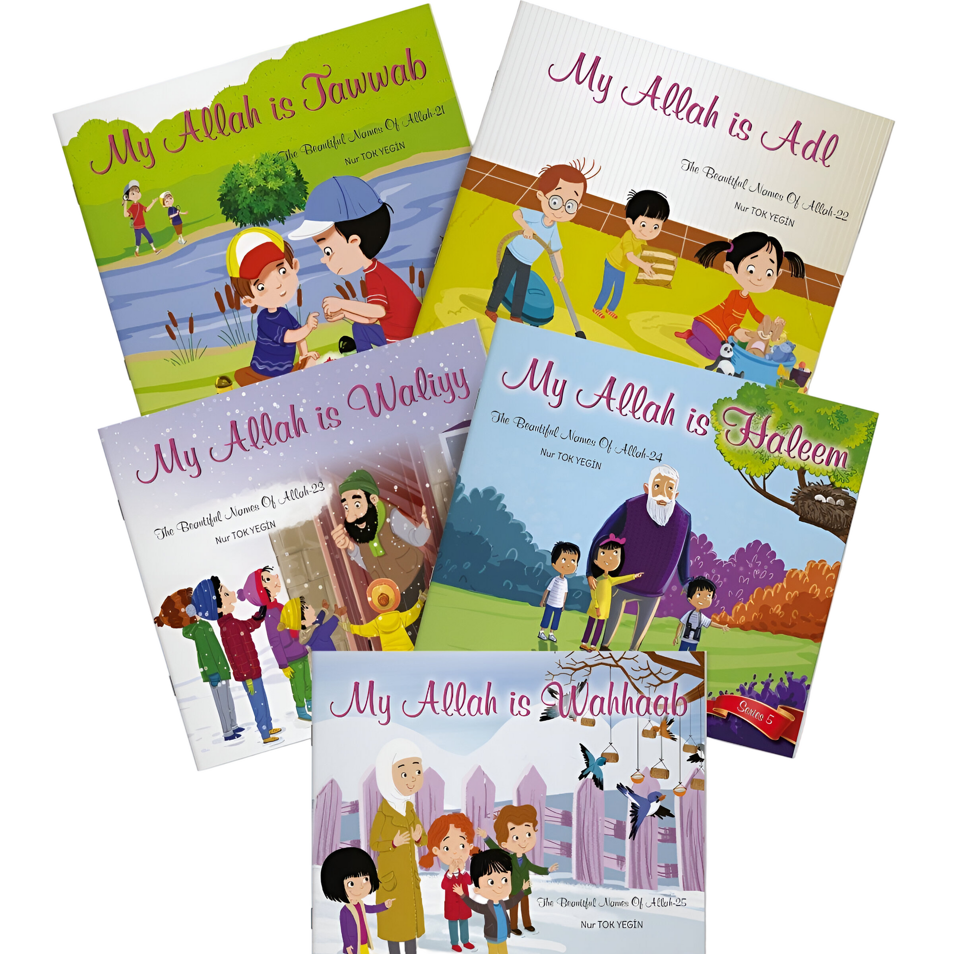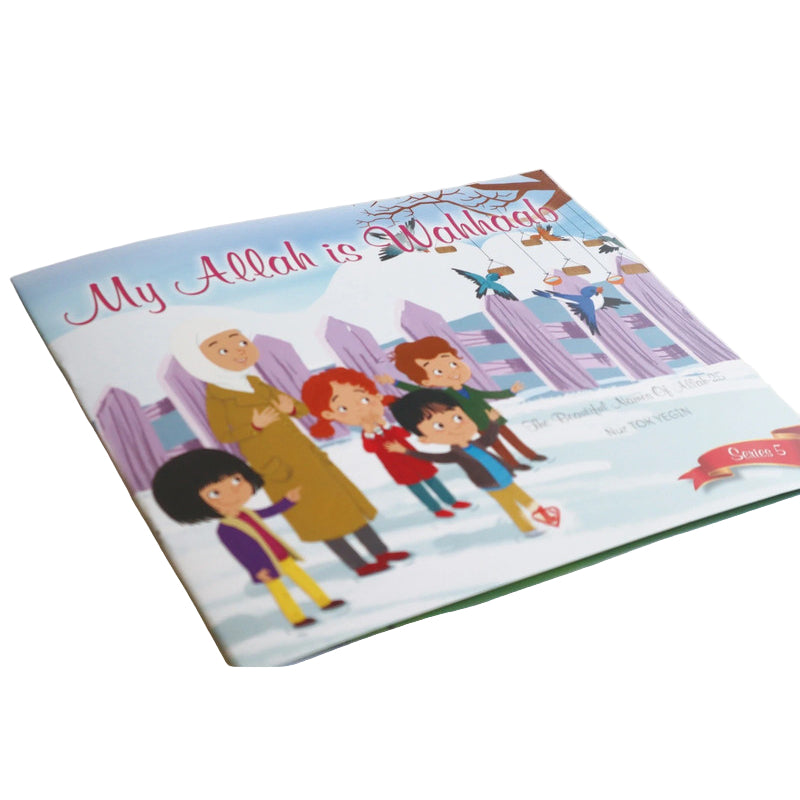 The Beautiful Names of Allah book set consists of five books that aimed to teach the Names of Allah ﷻ, which are Wahhaab, Tawwab, Adl, Haleem, and Waliyy, to preschool children with illustrated stories.