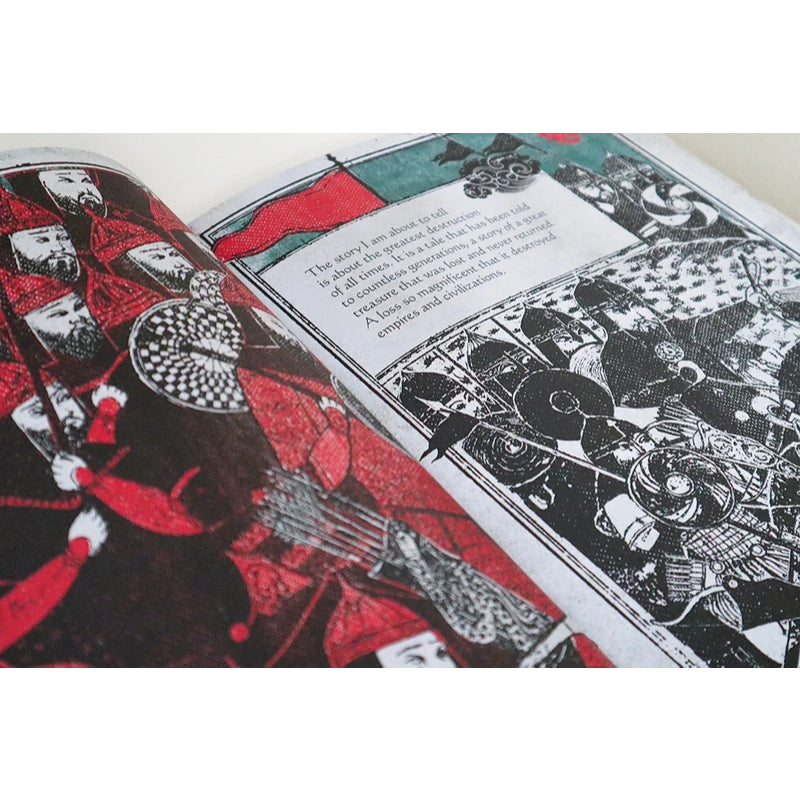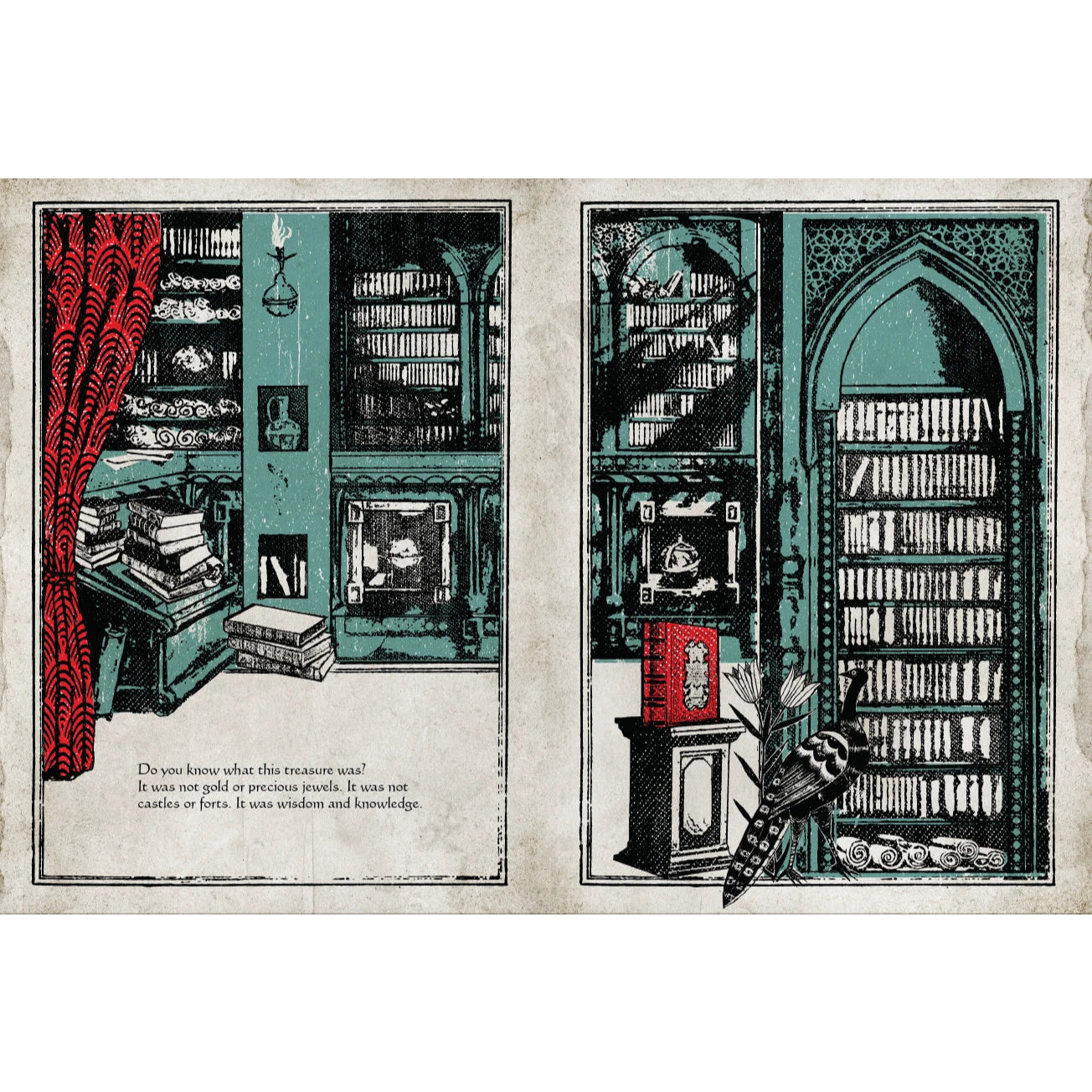 "This book won over the hearts and gaze of the jury for the power of its creativity and the overall excellence of its production. The historical events of the destruction of the celebrated Baghdad Library – one of the largest intercultural institutions of all times, in a city that was a centre for the exchange of ideas, the art of translation and the celebration of cultures and languages – are brought to life again in these intense pages like a timeless force. The text is characterised by an elegant and confident literary style in perfect harmony with the stunning iconography that recalls the ancient Islamic miniatures reimagined in a modern context using limited yet powerful colour combinations, with the black and green standing out in particular. The book contains memorable images, like that of the river that turns black, dyed by the ink from the books that have been thrown into its waters. The work appears today as both a warning and a tribute to the importance of books and literature, to dialogue and the peaceful cohabitation between cultures, a universal plea that resonates like a keepsake and that requires protection, resistance and care for the treasures of humanity and culture as a whole."